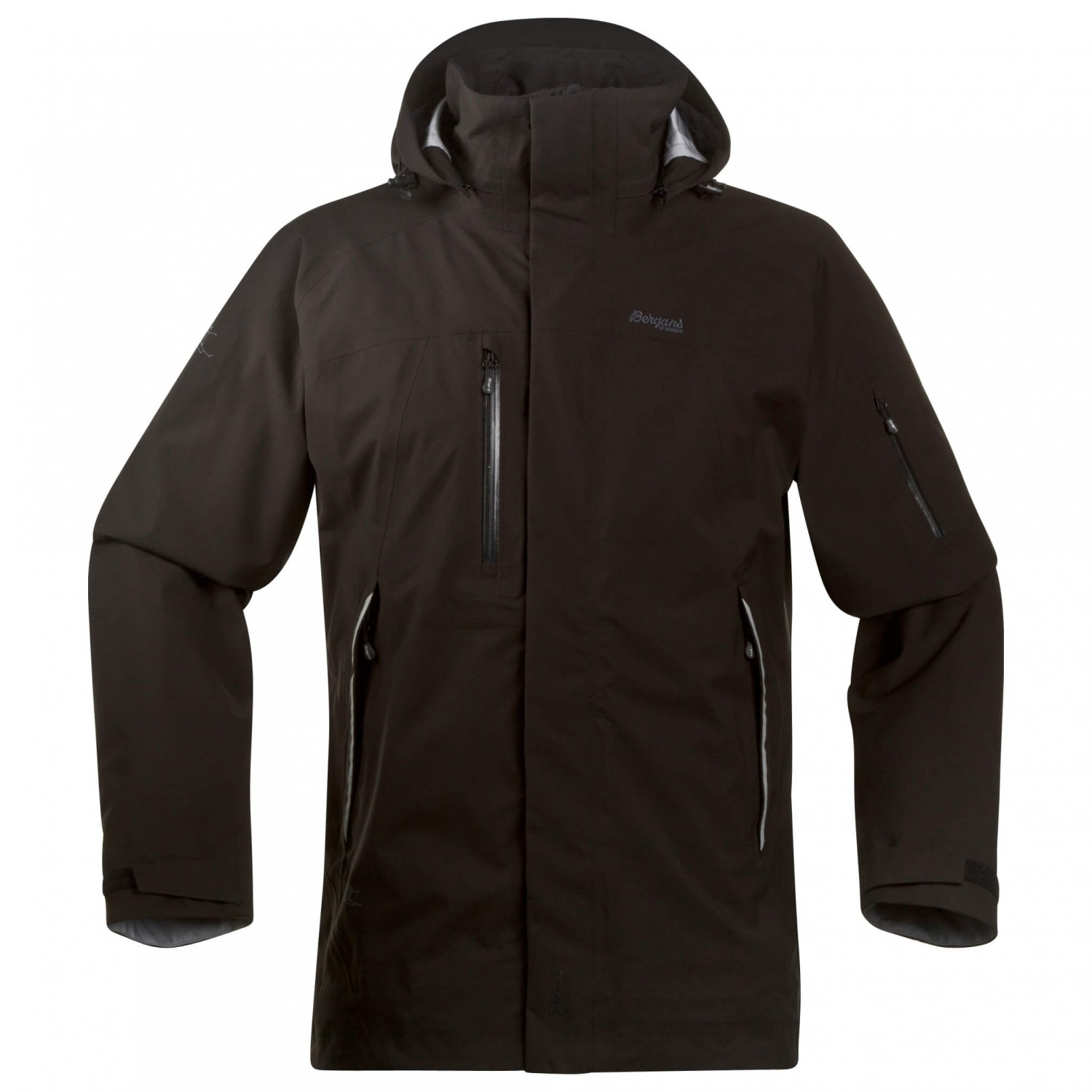 - Snoretræk i sømmen, reflekterende detaljer, justerbare ærmekanter, forformede ærmer, vandafvisende lynlåse