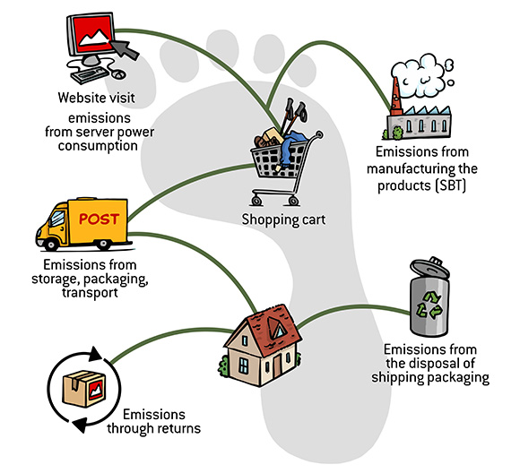 Reducing emissions is the motto. But before we implement any measures, it is important to know where greenhouse gas emissions occur along our value chain. Therefore, every year we recalculate how many emissions are caused by Alpinetrek's business activities. The graphic on the left shows you where and through which activities climate-relevant emissions are generated. When recording emissions, we take into account both direct and indirect emissions, i.e. those upstream and downstream in our value chain: from the energy consumption generated by visiting our online shop, to the emissions caused by packaging and transporting parcels. In preparing our carbon footprint, we adhere to the requirements of the Greenhouse Gas Protocol - an internationally recognised method for calculating corporate emissions. A carbon footprint shows us which are the most significant factors for effective carbon reduction. In our case, these are outbound logistics, returns, packaging and employee travel. Consequently, our climate protection strategy focuses on the reduction of these emission sources.