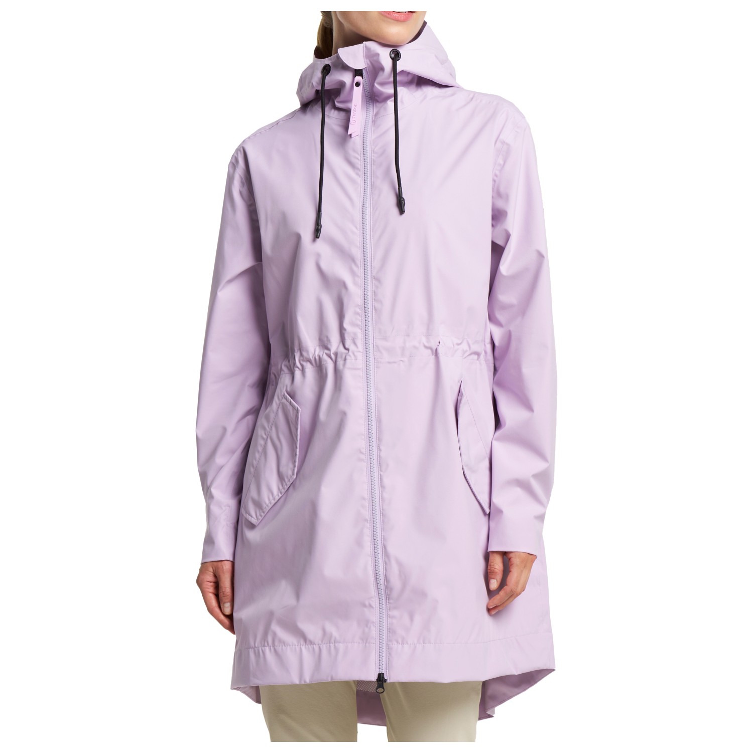 - Snoretræk i taljen, slids ved bageste søm, justerbare ærmekanter, vandafvisende lynlåse